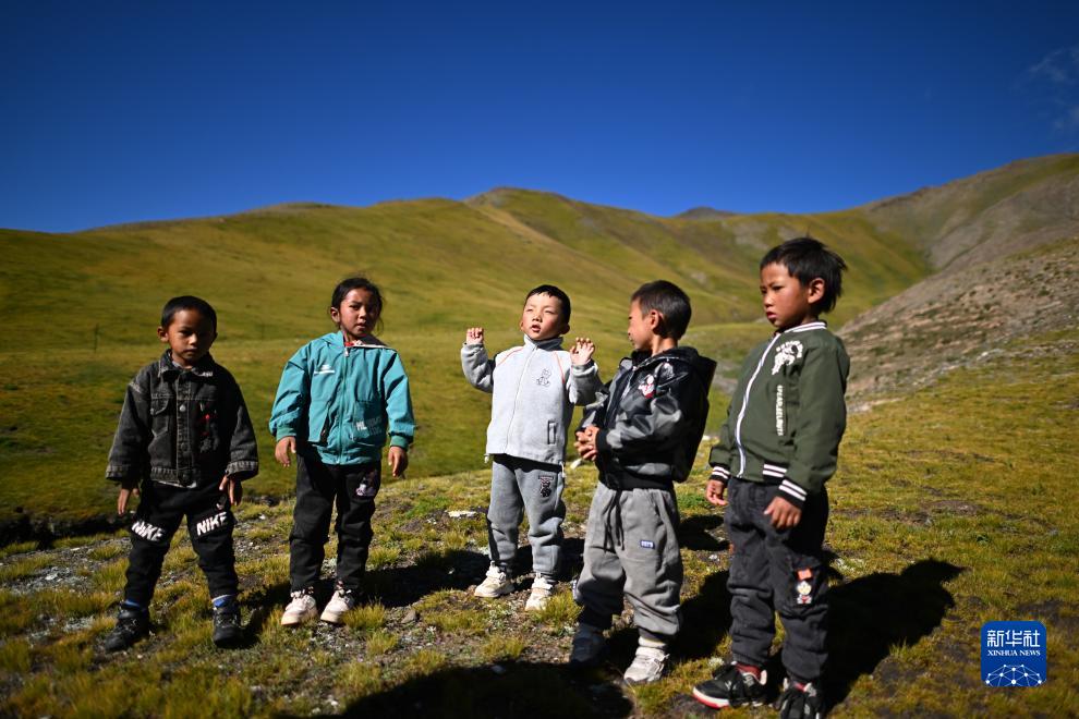 在青海省玉樹藏族自治州曲麻萊縣秋智鄉(xiāng)布甫村陽光幼兒園,歐周挪吾(左三)和伙伴們?cè)诮淌彝獾牟菰铣瑁?月14日攝)。新華社記者 張宏祥 攝