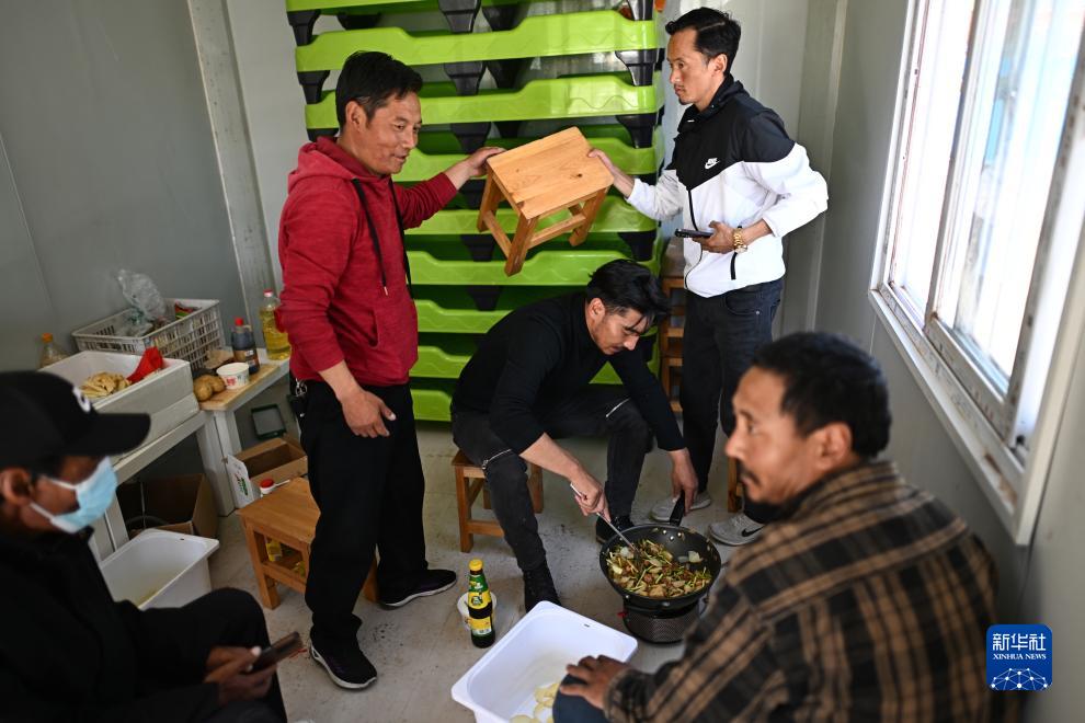 在青海省玉樹藏族自治州曲麻萊縣秋智鄉(xiāng)布甫村陽光幼兒園,秋智鄉(xiāng)幼兒園副園長(zhǎng)才仁戰(zhàn)斗(左三)在板房?jī)?nèi)為孩子們準(zhǔn)備午餐(9月14日攝)。新華社記者 張宏祥 攝