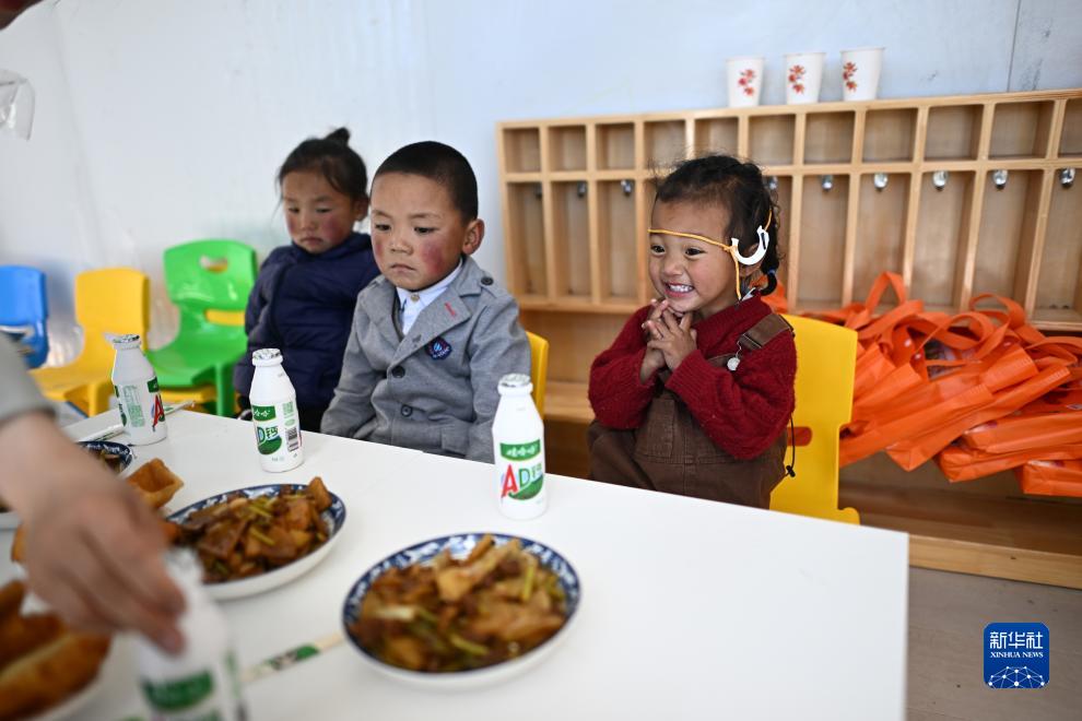 在青海省玉樹藏族自治州曲麻萊縣秋智鄉(xiāng)布甫村陽光幼兒園,丁增巴桑(右一)和伙伴們準(zhǔn)備吃午餐(9月14日攝)。新華社記者 張宏祥 攝