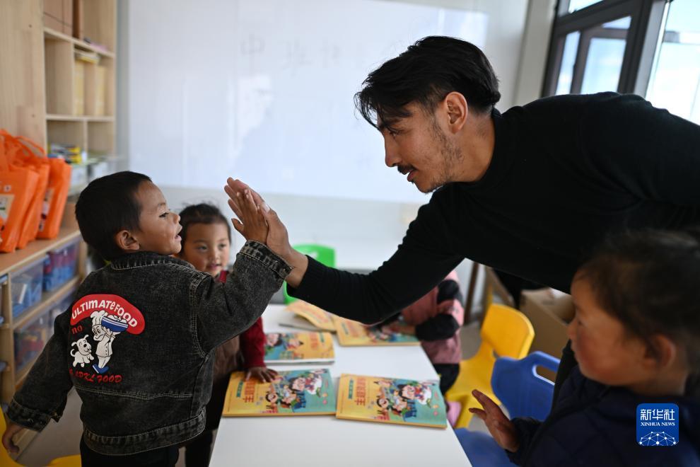在青海省玉樹藏族自治州曲麻萊縣秋智鄉(xiāng)布甫村陽光幼兒園,秋智鄉(xiāng)幼兒園副園長(zhǎng)才仁戰(zhàn)斗(右二)在課堂上和小朋友互動(dòng)(9月14日攝)。新華社記者 張宏祥 攝