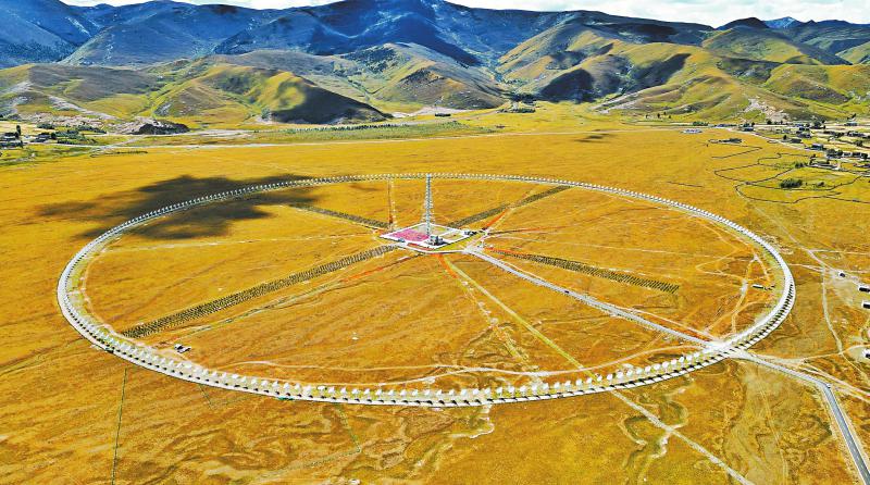 飛機從稻城亞丁機場起飛,右側舷窗外的地面隱現(xiàn)一個小圓點,因為造型特殊,當?shù)厝朔Q“千眼天珠”。小圓點其實一點也不“小”——在海拔3820米的四川省甘孜州稻城縣噶通鎮(zhèn),313部直徑6米的天線,均勻地分布在直徑1公里的圓環(huán)上。它的正式名字叫圓環(huán)陣太陽射電成像望遠鏡(下稱“圓環(huán)陣”),是國家重大科技基礎設施空間環(huán)境地基綜合監(jiān)測網(子午工程二期)的標志性設備之一,也是目前已建成的全球規(guī)模最大的綜合孔徑射電望遠鏡。其任務主要是對太陽和日地空間傳播鏈條進行高質量監(jiān)測,監(jiān)測太陽“打噴嚏”。