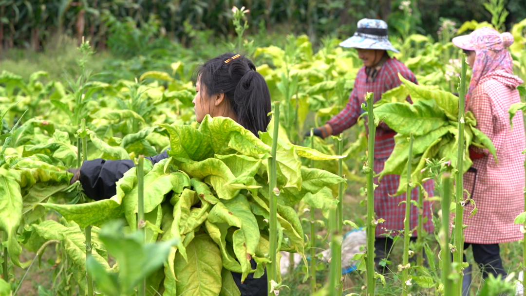 眼下,正是秋收農(nóng)忙時節(jié)。在上江福庫村的田野里,村民們正搶抓晴好天氣采摘煙葉,田間地頭處處洋溢著豐收的喜悅,紅土村村民和永軍在田間邊摘煙葉邊打開手機查看牛群動態(tài)情況。