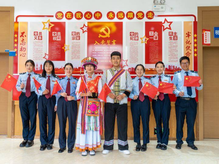 圖為在國家稅務總局維西傈僳族自治縣稅務局,傈僳族稅務干部身著民族服飾與其他稅務干部歡慶祝中華人民共和國成立74周年