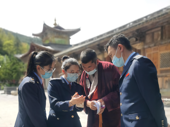 圖為縣稅務局“傈鄉(xiāng)稅宣小分隊”上門為壽國寺的藏傳佛教僧眾開展城鄉(xiāng)“兩險”手機繳納流程輔導和民族團結進步相關知識宣傳。