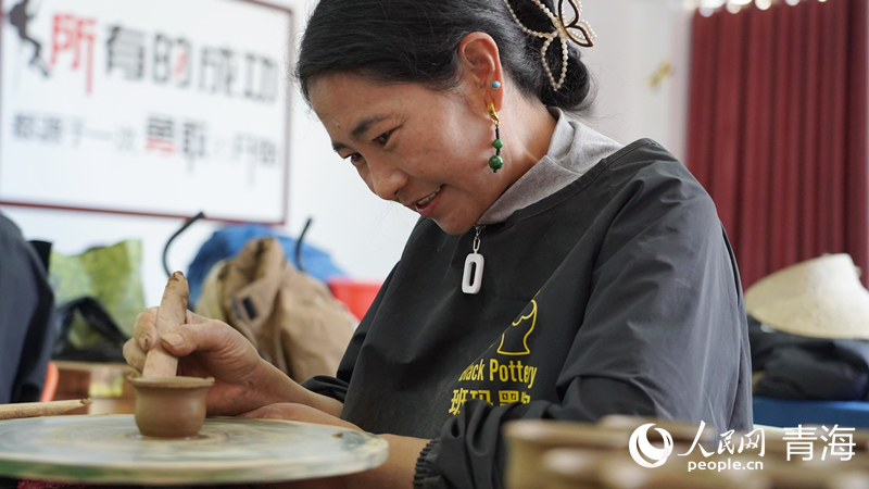 “平時(shí)家里開鋪?zhàn)幼錾?,每月利潤也有四五千。最近鋪?zhàn)由獠惶?,跟妻子一起來學(xué)習(xí),學(xué)會(huì)了也可以自己制作黑陶,增加收入。”金措的丈夫就坐在旁邊,邊打磨坯體上沿,邊講述自家情況,一件碗狀的坯體即將完工。