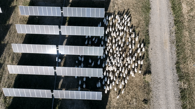 在深藍色的光伏板下,郁郁蔥蔥的牧草向上生長,園區(qū)里的“光伏羊”啃食青草,奔跑追逐,成為當(dāng)?shù)匾瞬毮康娘L(fēng)景。