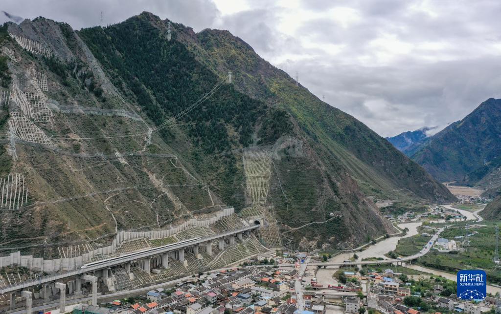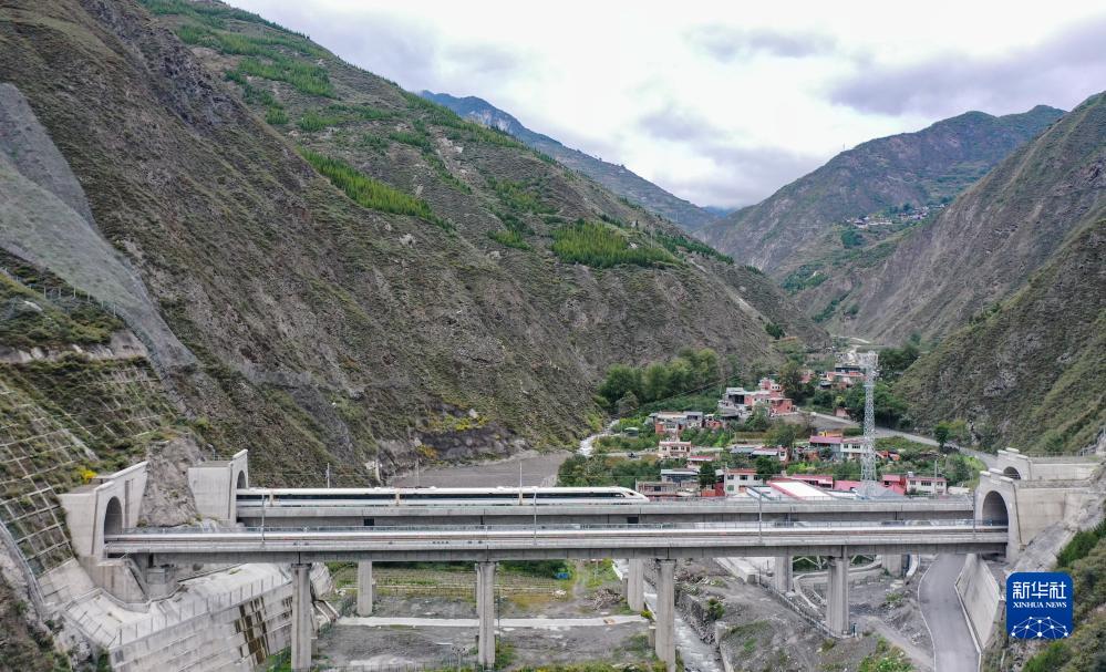 調(diào)試列車駛?cè)氪ㄇ噼F路茂縣站(10月13日攝,無人機照片)。新華社記者 王曦 攝