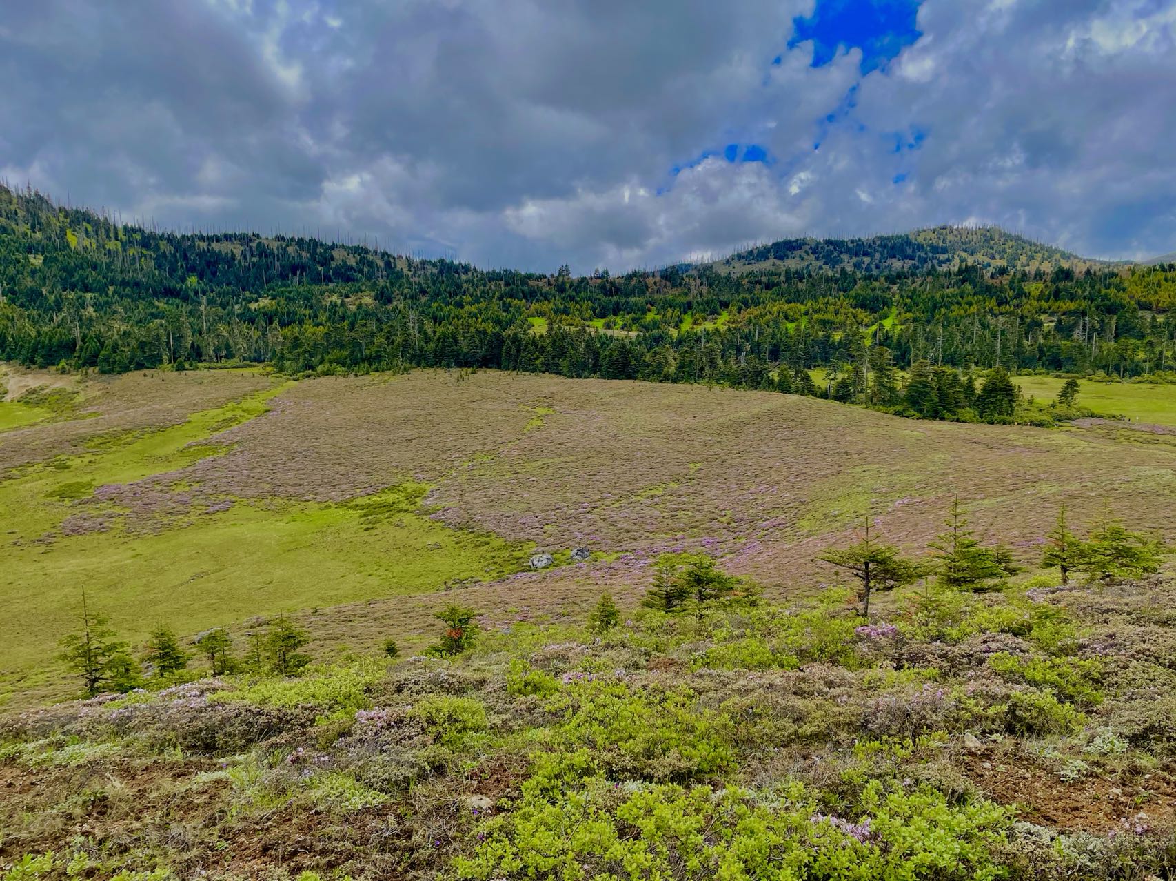 千湖山藏語稱“拉姆冬措”,意為神女千湖或仙女千湖,以三碧海、大黑海為中心,向四周散開。千湖山上共有大大小小近300個高山湖泊,堪稱云南高山湖泊最集中的地方。千湖山的湖有的圓若明鏡,有的長似游魚;有的開闊平坦,有的幽深寧靜;有的半環(huán)于山洼深處,有的掩映于杜鵑叢中;有的似珠玉成串,有的孤懸于草甸中間;有的怪石露出如鱷魚探頭,有的水色深沉似無底深淵……真是千姿百態(tài)。千湖山周圍被原始森林所覆蓋,多為高大筆直的冷杉、云杉。湖畔長滿了杜鵑林,多是黃杜鵑、紅杜鵑和白杜鵑,花冠碩大,色澤鮮艷。