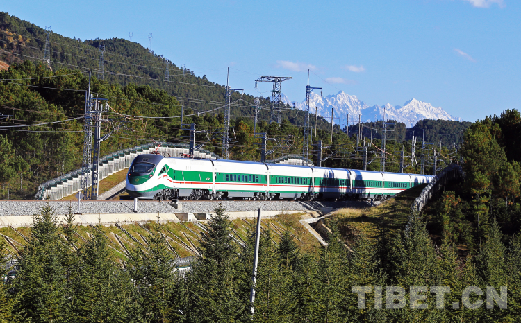 圖為“復(fù)興號(hào)”動(dòng)車組列車,鐵路沿線植被茂密,也可見(jiàn)美麗的雪山,宛如一幅畫卷。迪慶日?qǐng)?bào)社供圖