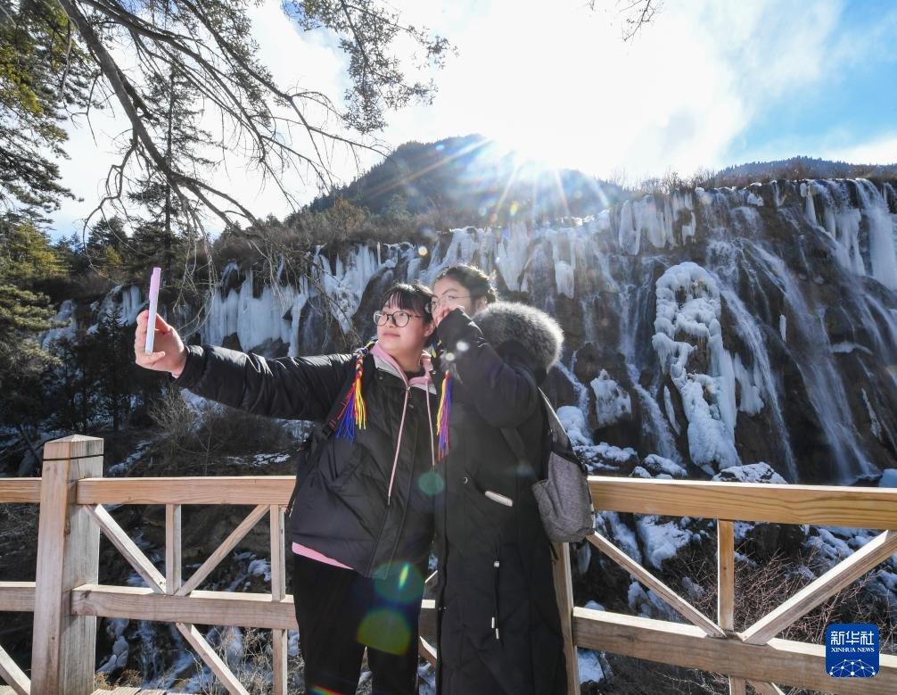 1月4日,游客在九寨溝風(fēng)景名勝區(qū)冰瀑景觀前留影。新華社記者 王曦 攝