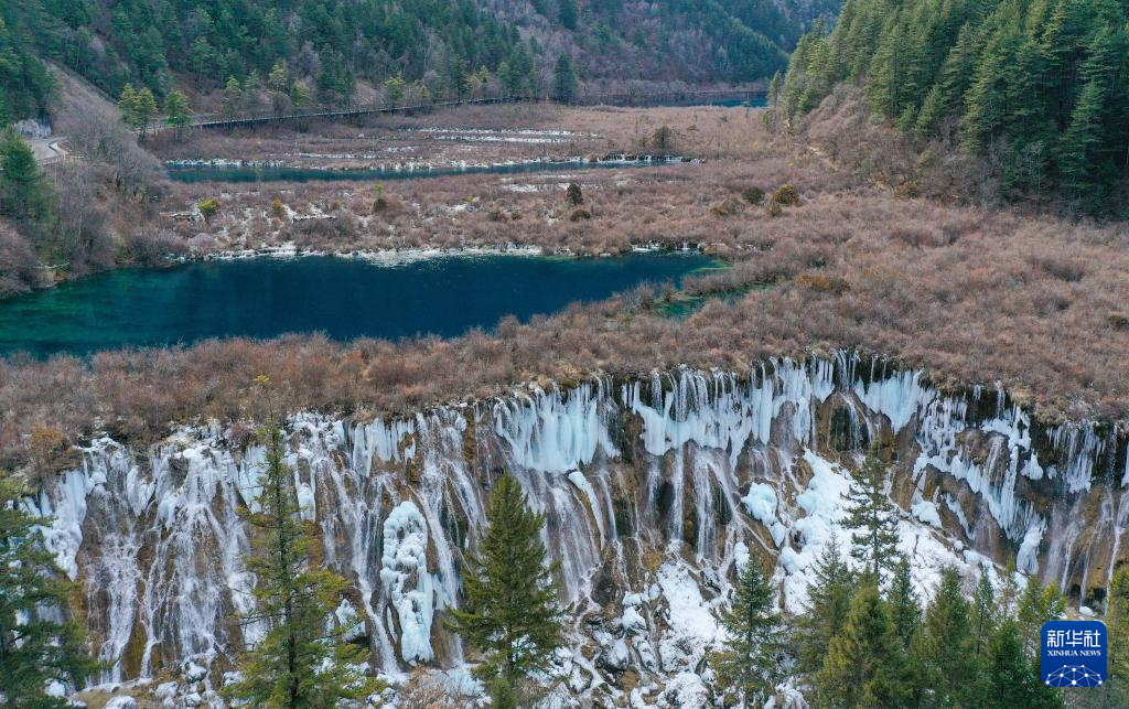 這是1月4日在四川省九寨溝風(fēng)景名勝區(qū)拍攝的諾日朗瀑布形成的冰瀑景觀(無人機照片)。新華社記者 王曦 攝