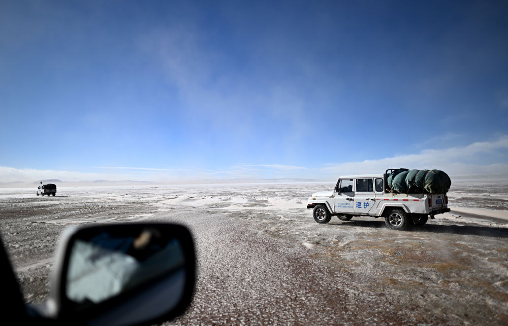 在可可西里卓乃湖區(qū)域附近,可可西里森林公安局巡山車輛在巡查途中(1月19日攝)。新華社記者 張宏祥 攝