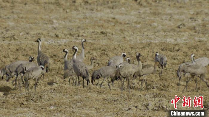 圖為灰鶴群在草地上嬉戲。仁增加措 攝