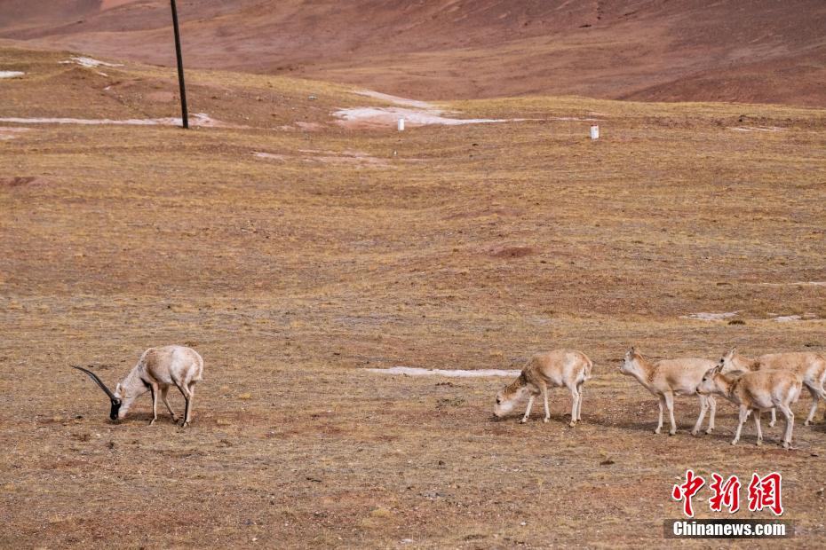青藏公路沿線藏羚羊等野生動(dòng)物悠閑覓食