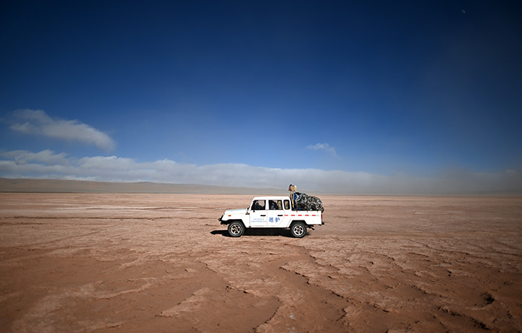 車輛越是深入無(wú)人區(qū),空氣中氧氣含量越稀薄,道路越難走。在顛簸近七個(gè)小時(shí)后,記者和巡山隊(duì)員到達(dá)了可可西里中心地帶、重點(diǎn)巡護(hù)區(qū)域——卓乃湖。