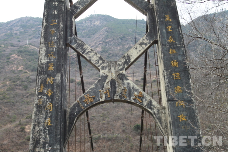 據(jù)了解,大渡河橋東西橋頭塔高分別為16米,孔徑132米,橋面4.5米,由27根直徑約3厘米大小的綱繩分布于左右兩側(cè),中間分別由45根同樣大小的鋼纜吊桿將橋身懸吊在大渡河上,橋身由無數(shù)鋼架鉚焊而成,鋼架之上鋪有約0.5米見方的方橙枕木,上鋪“人”字型拼木,允許載重量15噸。東西橋頭分別建有堅(jiān)固的崗?fù)?,西橋頭正面豎有三道屏墻,左為原中國(guó)人民解放軍第十八軍軍長(zhǎng)張國(guó)華,政委譚冠三撰寫的碑文,中間書有毛澤東同志七律《長(zhǎng)征》詩手跡,右為建橋工程說明。
