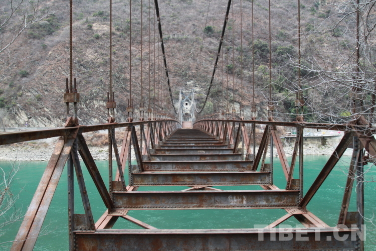 該橋始建于1950年11月。當(dāng)時(shí)為了徹底解放西藏、鞏固西南邊防,中國(guó)人民解放軍第十八軍在劉伯承、鄧小平、賀龍等同志“一面進(jìn)軍,一面建設(shè)”的號(hào)召下,在修筑川藏公路的同時(shí),由西南交通部負(fù)責(zé),廣大解放軍指戰(zhàn)員、全體技術(shù)人員和各路民工發(fā)揚(yáng)不怕犧牲的革命精神,克服一切困難,修建了川藏公路上的第一座鋼索懸橋,于1951年5月底勝利完成了建橋任務(wù)。