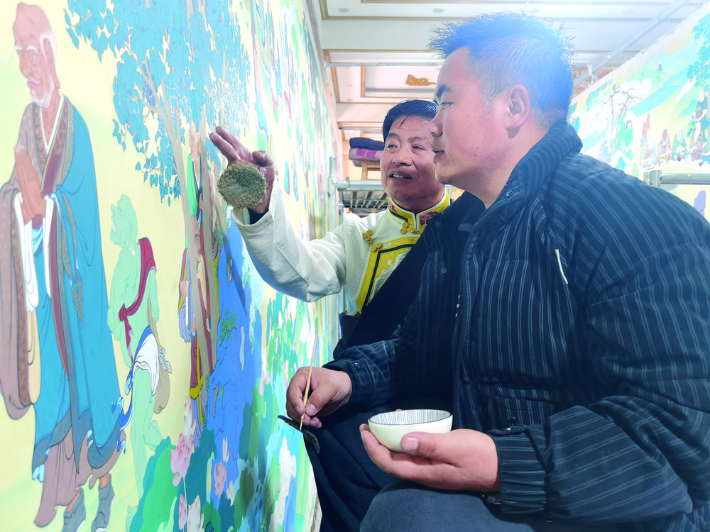 “小范,朱砂顏色有點厚,碗里再加點水,顏料稠度要合適,這樣顏料不易從畫布上剝落……”扎西尖措耐心地指導徒弟范慶基。每天,扎西尖措都會來畫室轉(zhuǎn)轉(zhuǎn),為徒弟指出繪畫、上色等方面的不足之處,幫助他們更快進步。