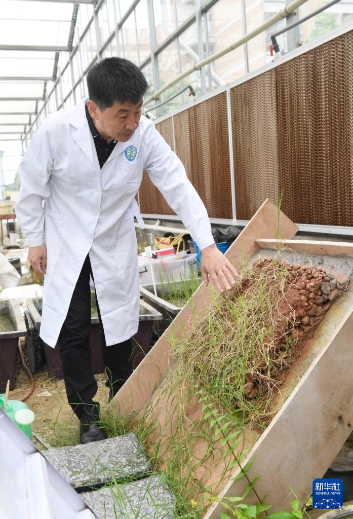 4月20日,在成都理工大學(xué)生態(tài)環(huán)境學(xué)院教學(xué)實(shí)踐基地內(nèi),裴向軍在介紹其團(tuán)隊(duì)培育的防沖防淹輕質(zhì)植生塊。新華社記者 劉坤 攝