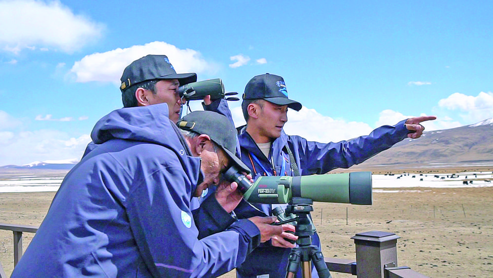 巴桑才仁(中)與管護(hù)員觀測鳥類。張得俊 攝