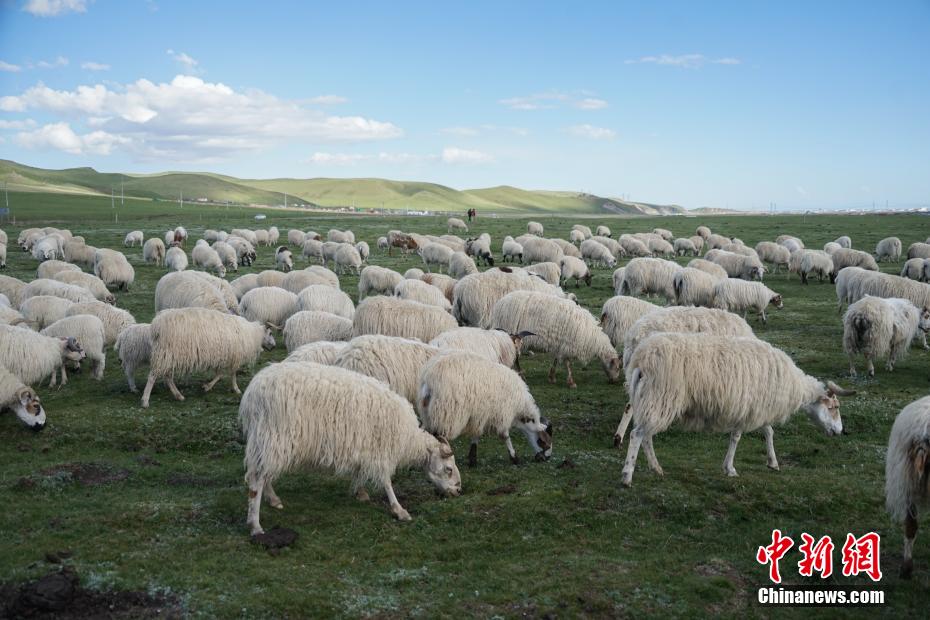 6月4日,羊群在青海省海北藏族自治州剛察縣草原上覓食。馬銘言 攝