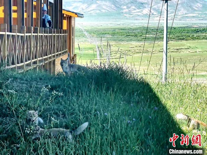 圖為青海湖金沙灣景區(qū)廚師看著藏狐一家。中新社記者 李雋 攝
