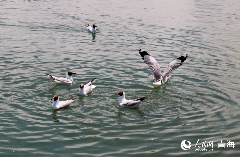青海湖中嬉戲的水鳥。人民網(wǎng) 馬可欣 攝