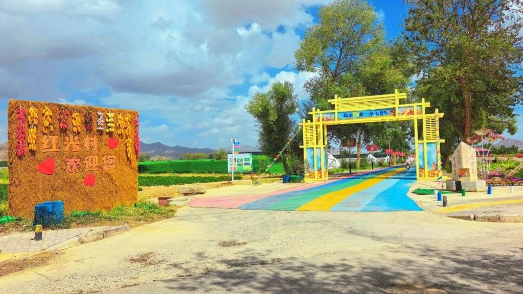 一條繽紛亮眼的“彩虹步道”從村口一直向里延伸,“彩虹步道”兩旁種滿了瓜果蔬菜,不遠處還有采摘體驗園和燒烤露營地,在青海省海西蒙古族藏族自治州德令哈市郊的紅光村,別樣的田園風情給烈日炎炎下的德令哈增加了一絲清爽。