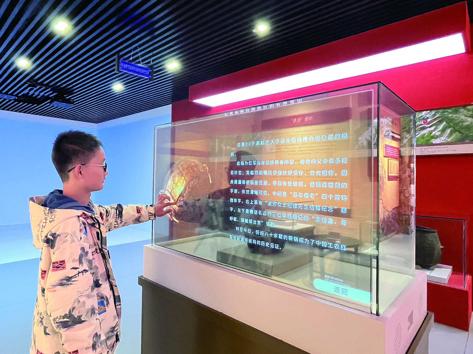 游客正在紅軍溝紀念館內(nèi)觀看文物介紹。