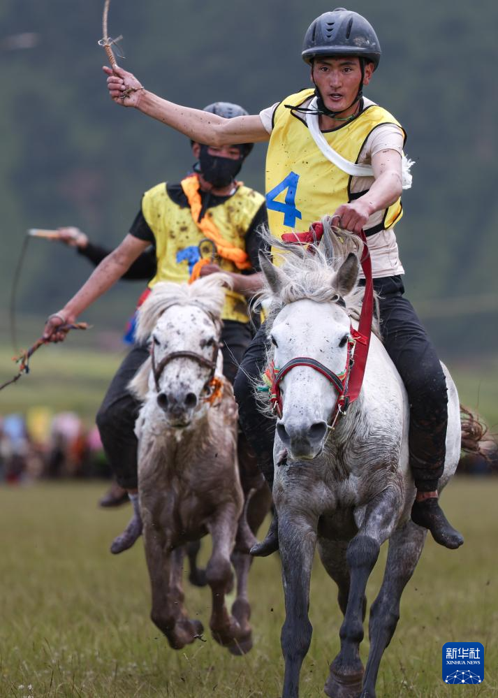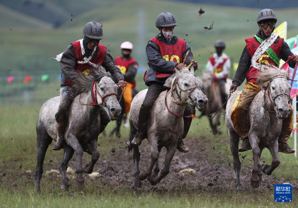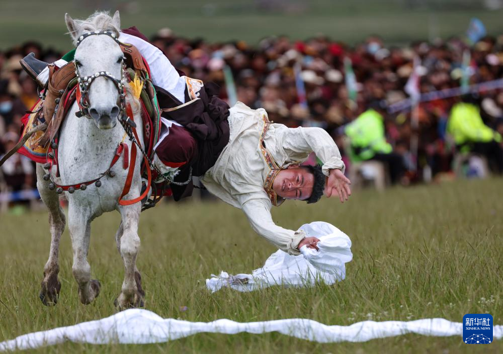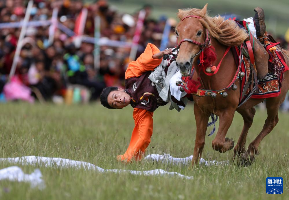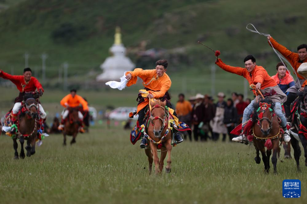7月28日,當(dāng)?shù)厝罕娫趨⒓域T馬拾哈達(dá)比賽。新華社記者 江宏景 攝