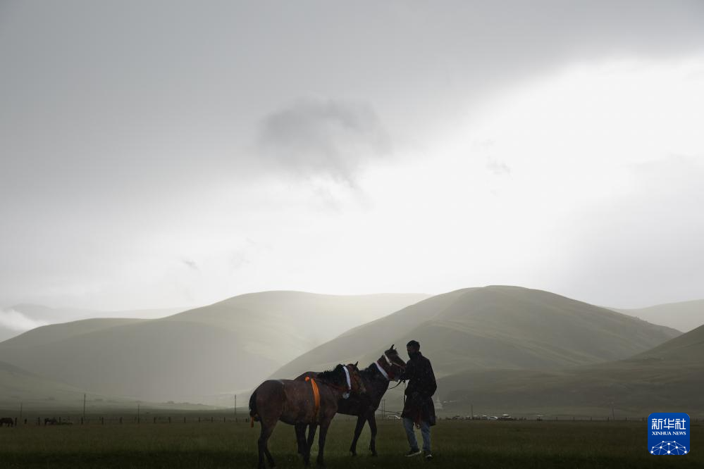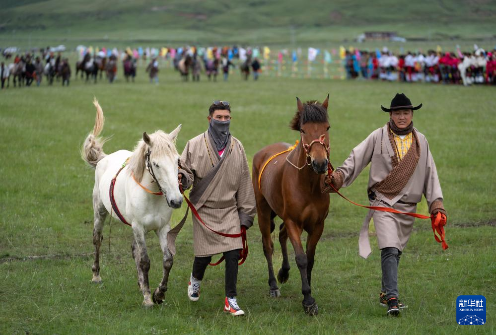 7月27日,兩名藏族群眾牽著馬走進(jìn)賽場(chǎng)。新華社記者 江宏景 攝