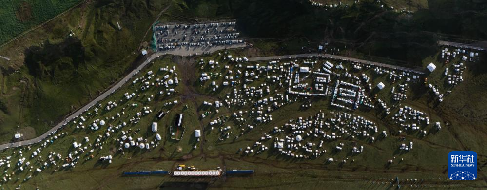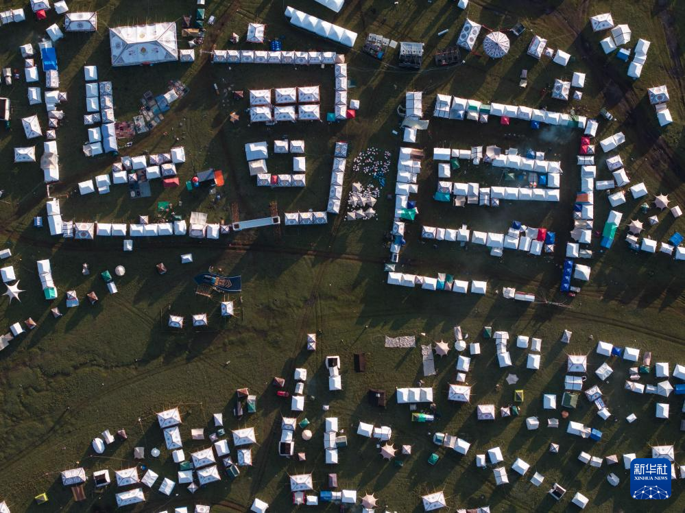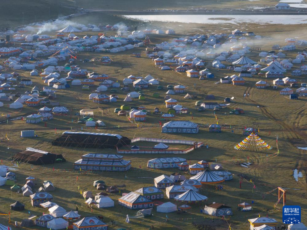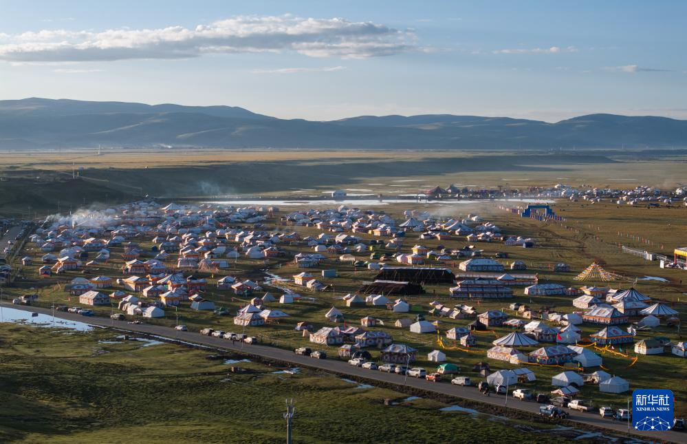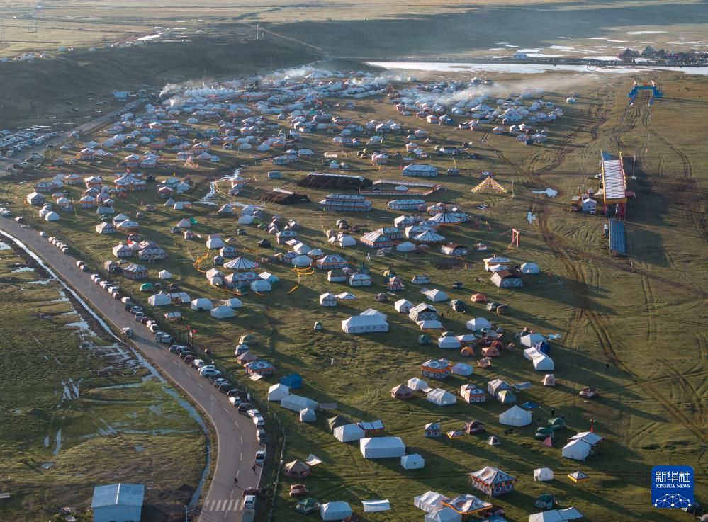 在四川省甘孜藏族自治州理塘縣多旺塘拍攝的草原上的“帳篷城”(7月31日攝,無(wú)人機(jī)照片)。新華社記者 江宏景 攝