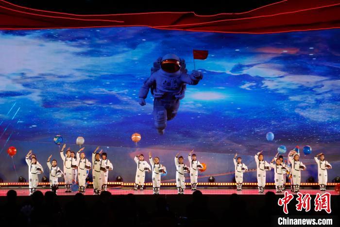 圖為晚會現(xiàn)場兒童表演舞蹈《浩瀚的家,藍(lán)天的夢》。中新社記者 馬銘言 攝