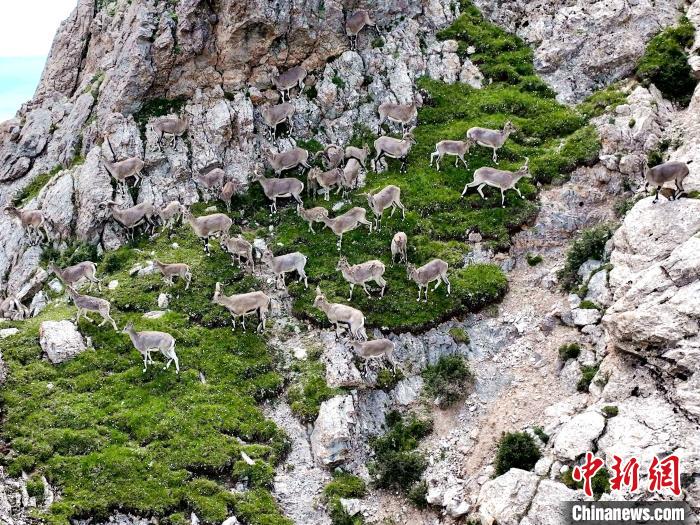 圖為成群巖羊在山坡上結伴而行。才新木加 攝