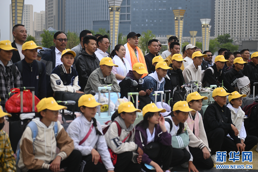 學(xué)生及家長、老師在西寧火車站站前廣場合影。新華社記者 張龍 攝
