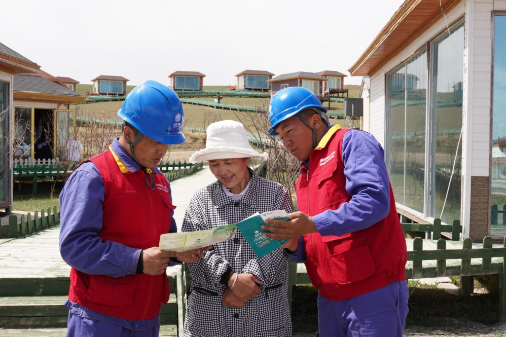 9月2日,“石榴籽”電力流動(dòng)驛站工作人員為果洛藏貢麻村崗日梅朵旅游度假村工作人員講解安全用電知識(shí)。(旺瑪多杰 攝)
