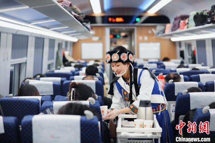 “歡迎大家嘗嘗我們列車上的酥油茶,正宗的咧?!憋w馳的列車上,格茸培楚身著藏族服飾,用藏語和普通話向乘客介紹著列車上充滿民族風味的特色飲品和美食。