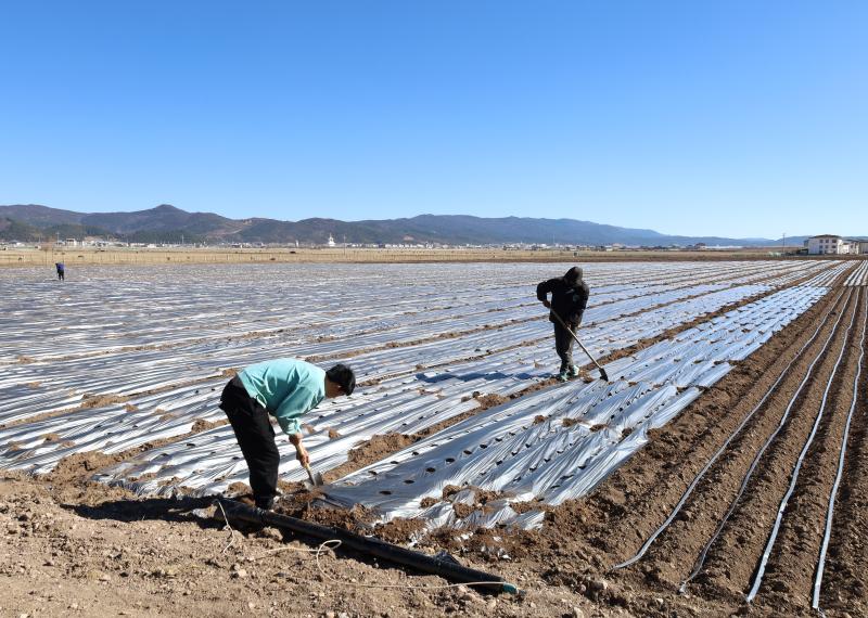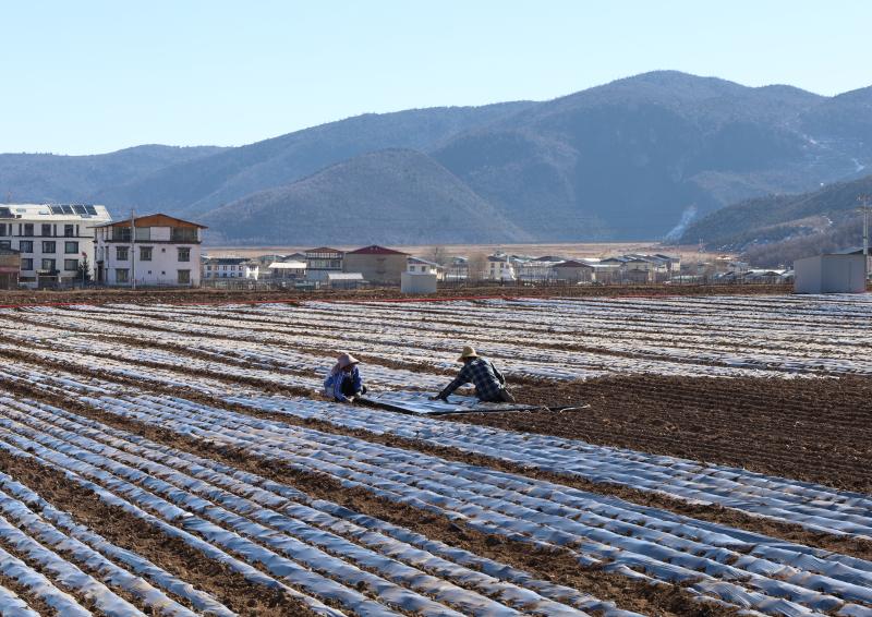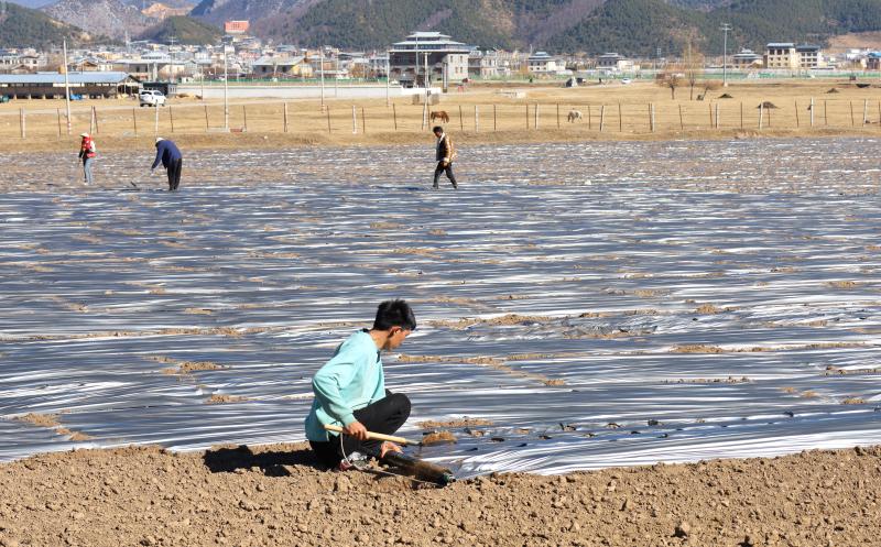 近日,記者在香格里拉市建塘鎮(zhèn)尼史村布倫村民小組看到,工人們正忙著在萵筍基地里鋪設(shè)水管、覆膜、培土,為節(jié)后種植萵筍做好準(zhǔn)備。