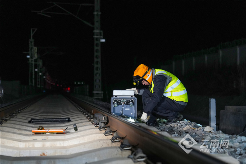 23時(shí),趙麗程和工友們到達(dá)作業(yè)點(diǎn),他們分工合作,開始對(duì)設(shè)備進(jìn)行機(jī)械參數(shù)測(cè)定、測(cè)溫探頭定標(biāo)、電流信號(hào)傳輸試驗(yàn)等工作。寂靜的股道上,他們彎腰、下蹲、匍匐,盡量讓視線與鋼軌平齊保證機(jī)械參數(shù)測(cè)量精度,點(diǎn)點(diǎn)頭燈在軌道間不停晃動(dòng),操作工具發(fā)出的“叮當(dāng)”聲格外響亮。