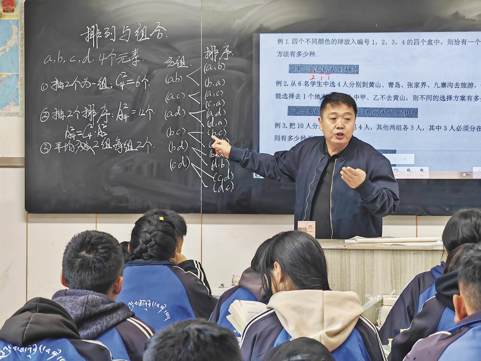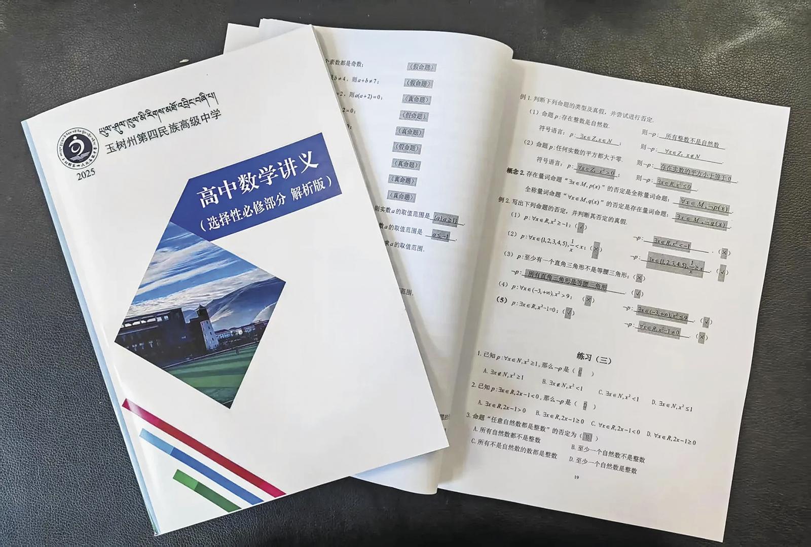 6月16日,在青海省玉樹藏族自治州第四民族高級中學高二7班的教室內,孩子們每個人手里拿著一本《高中數(shù)學講義(必修部分)解析版》認真翻看。
