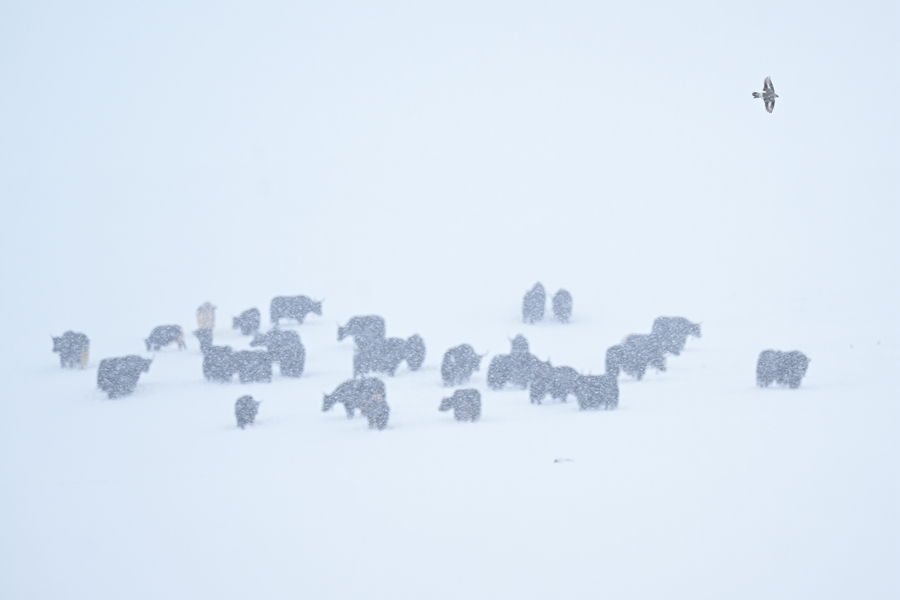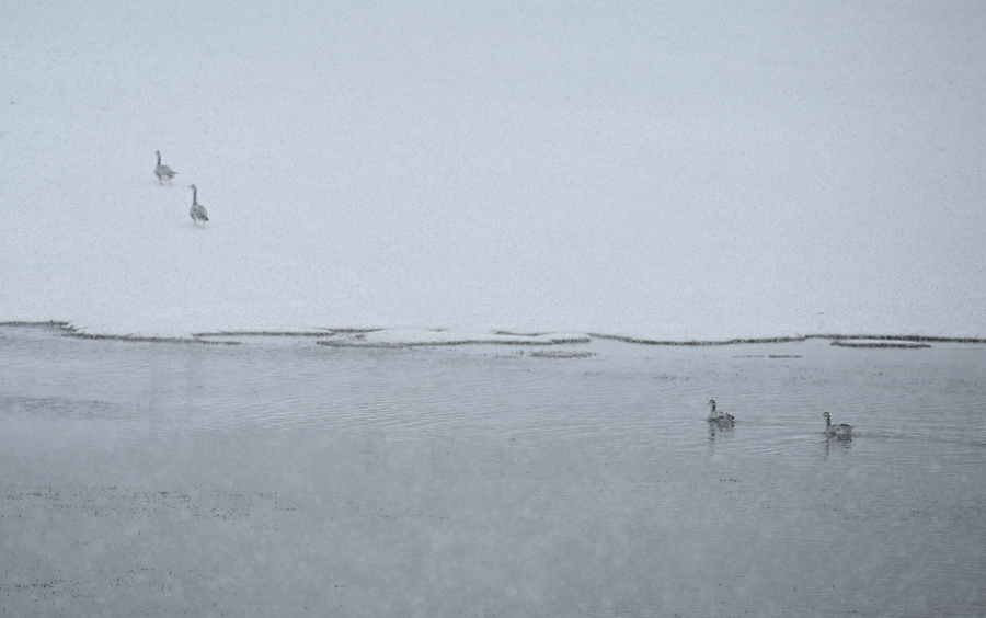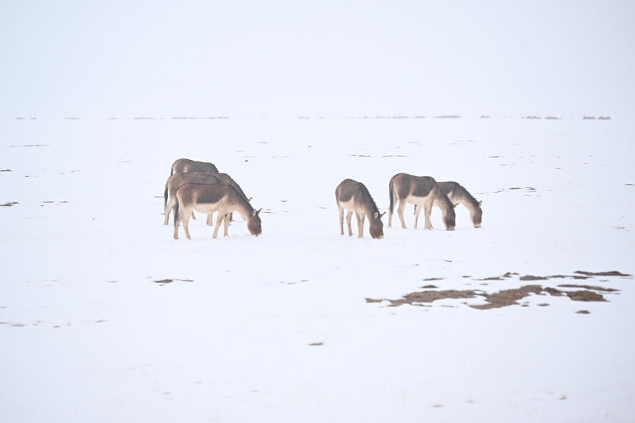 令人驚喜的是,風(fēng)雪中的源頭并不冷清。三五成群的藏野驢在緩坡上覓食,棕褐色的脊背上落滿雪花,卻走得從容不迫;幾只藏原羚從遠處躍過雪地,靈巧的身影在風(fēng)雪中一閃而過,很快消失;斑頭雁貼著湖面低飛,時而盤旋,時而鳧水。這樣的場景,在當(dāng)?shù)厣鷳B(tài)管護員看來,已不罕見。