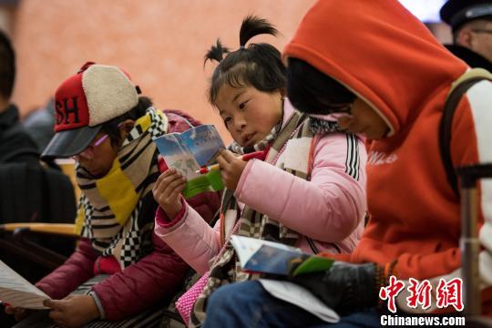 在候車(chē)室內(nèi),小姑娘正閱讀拉薩火車(chē)站發(fā)放的安全防護(hù)知識(shí)。 何蓬磊 攝