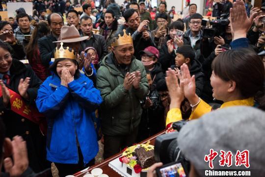2月1日,拉薩火車(chē)站在候車(chē)室為兩名旅客慶祝生日。 何蓬磊 攝