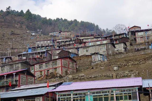 陳塘鎮(zhèn)錯(cuò)落有致的夏爾巴民居,家家屋頂紅旗招展