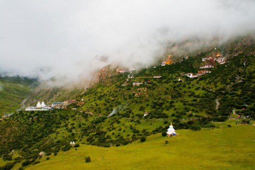 紅白相間的建筑群,牦?;蚬酚迫蛔缘玫嘏P著;偶爾有幾個(gè)僧人慢慢走過,或論著經(jīng)書,或拿水壺……世俗與修行,喧囂與寧靜,在這里有著絕妙地平衡。