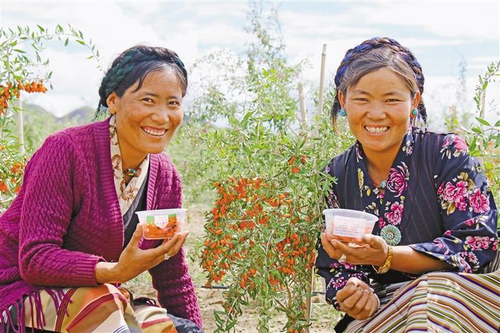 圖為當?shù)厝罕娬谡故驹谌湛t市白朗縣嘎東鎮(zhèn)枸杞產(chǎn)業(yè)園區(qū)配套水保綜合項目內(nèi)收獲的枸杞。