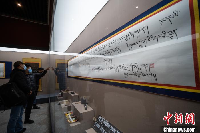圖為民眾參觀藏文書(shū)法展。何蓬磊 攝