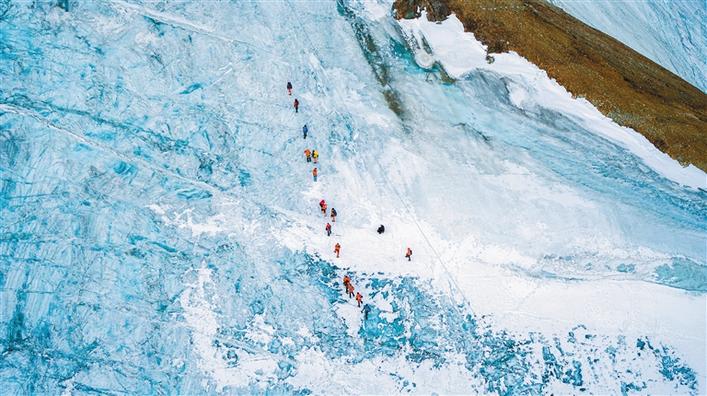 圖為當雄縣格達鄉(xiāng)境內的廓瓊崗日冰川公園內,游客與冰川近距離接觸,體驗攀登的樂趣。