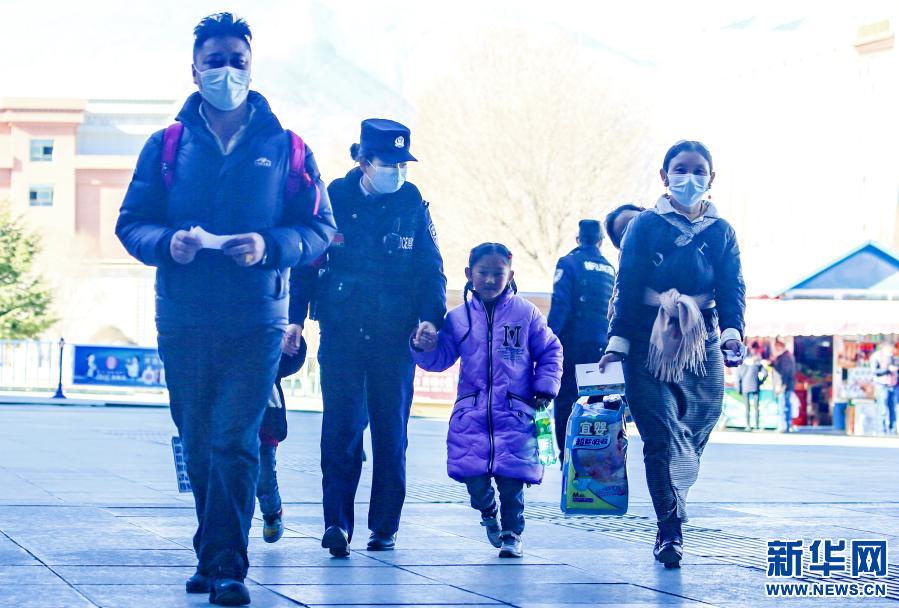 1月10日,“女子格?;ā本M民警在拉薩火車站帶領小旅客出站。新華社發(fā)(胡安鵬、黃飛攝影報道)