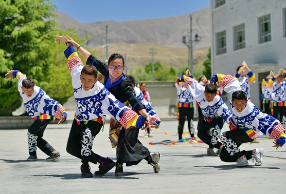 在西藏山南市第一高級中學(xué),來自湖北省武漢市旅游學(xué)校的援藏教師馬丹(左三)指導(dǎo)學(xué)生練習(xí)校園啦啦操。記者 張汝鋒 攝